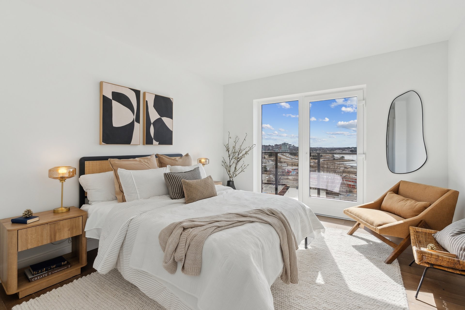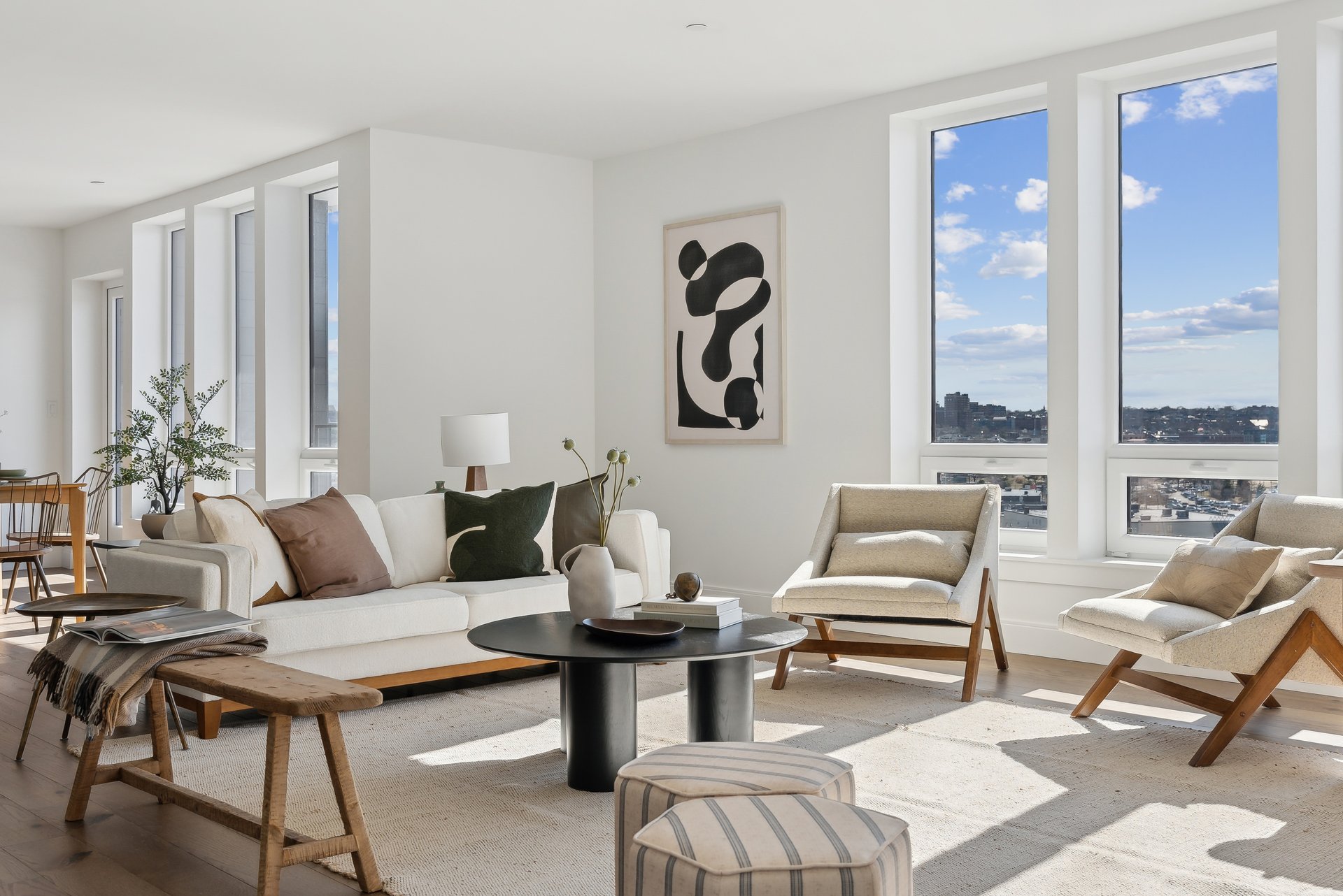 I’ve done partial stages before with accessories, plants, throw pillows, etc. but recently I had the pleasure of fully staging a vacant penthouse myself, blending a modern organic style with vintage finds from F.O. Bailey Antiquarians. Every detail—from antique sleigh bells to a worn ladder—was handpicked to create a space that feels elevated and curated.